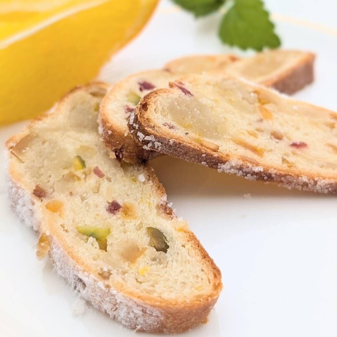 爽やかなレモン、甘酸っぱいアプリコット、香ばしいピスタチオ、甘みと酸味が絶妙に絡み合うクランベリー、そして国産レモンの皮がたっぷりと贅沢に使われています。