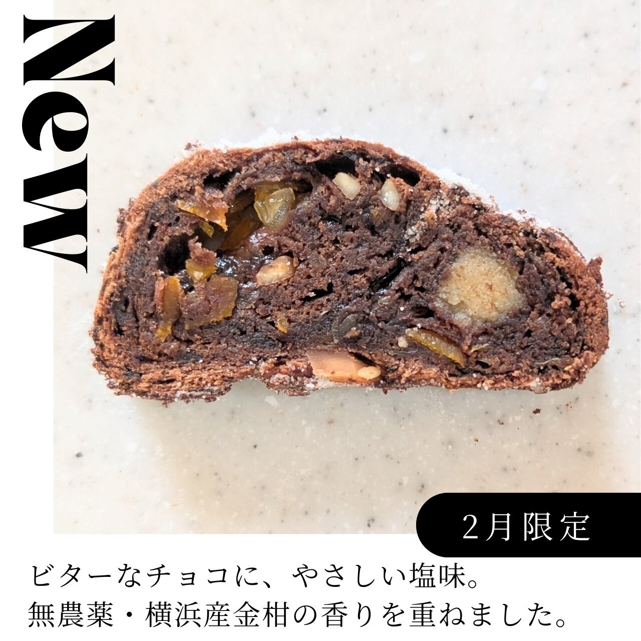 小麦粉(夢かおり・スペルト小麦)、無塩バター、牛乳、甜菜糖、粉糖、グラニュー糖、ローマジパン、ココアパウダー、チョコレート(シェービングチョコ)、金柑(横浜産・無農薬)、アーモンド、洋酒(グランマルニエ)、イースト、岩塩、シナモン、トッピングシュガー