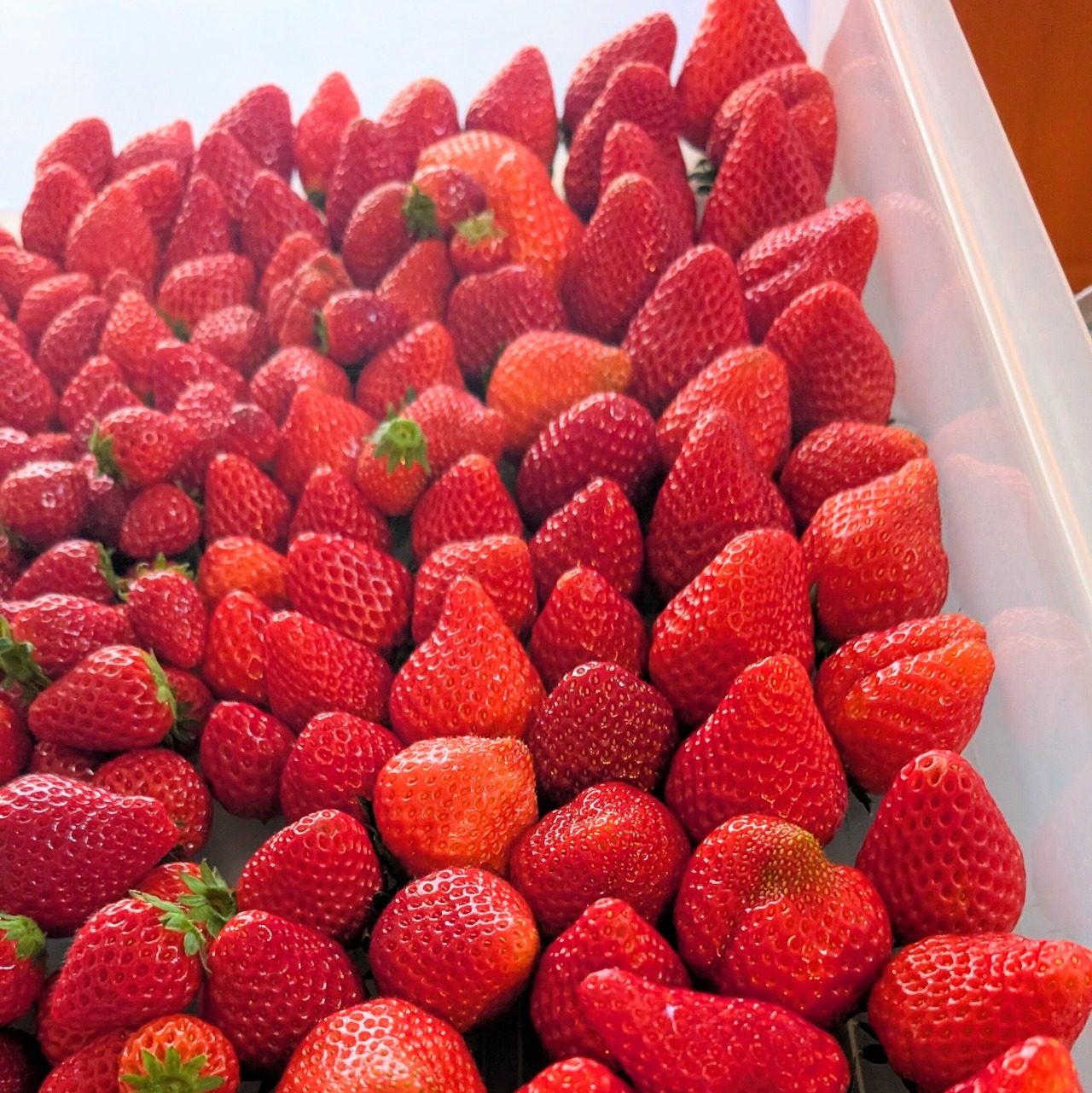 これまではフリーズドライを使用しておりましたが、今年は私自ら農園へ足を運び、太陽の恵みをいっぱいに浴びた完熟いちごを3kg仕入れました。
