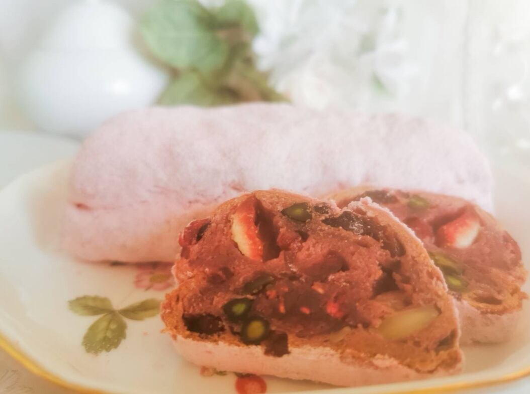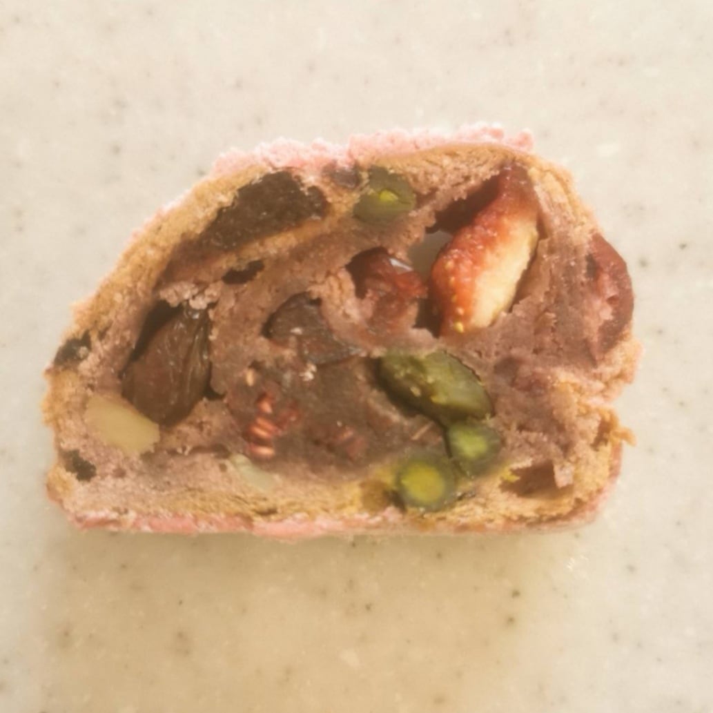 古代小麦を使用した身体に優しい生地に、ピスタチオなどのナッツ、赤ワインに漬けた4種のベリー、バニラやアニスのスパイスを加え、ほんのりピンク色の見た目も可愛らしい一品となっています。