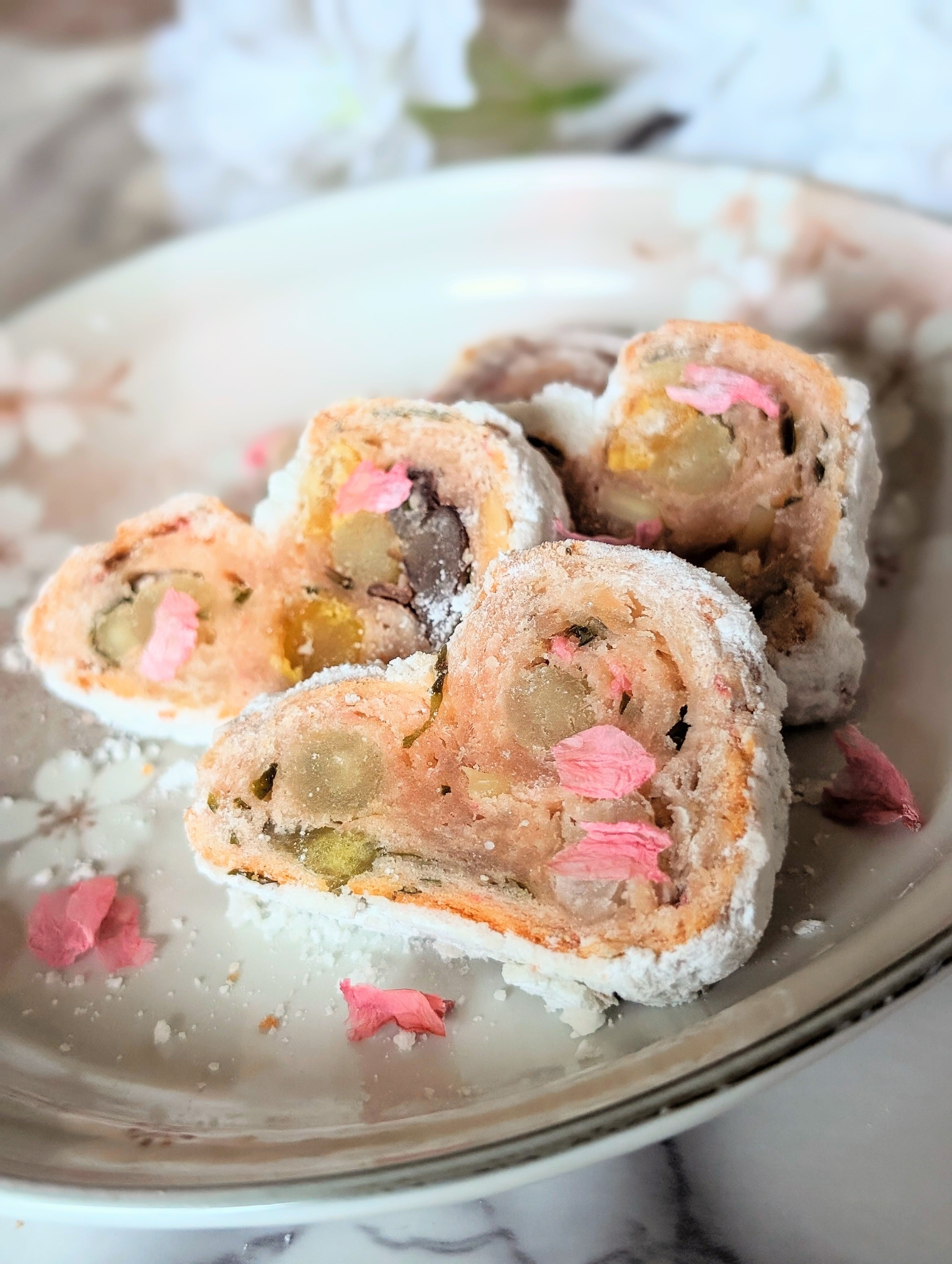桜パウダーでほんのりピンクに色づいた生地と、3色の甘納豆。カットした瞬間、春の彩りが目に飛び込みます。
