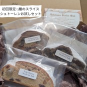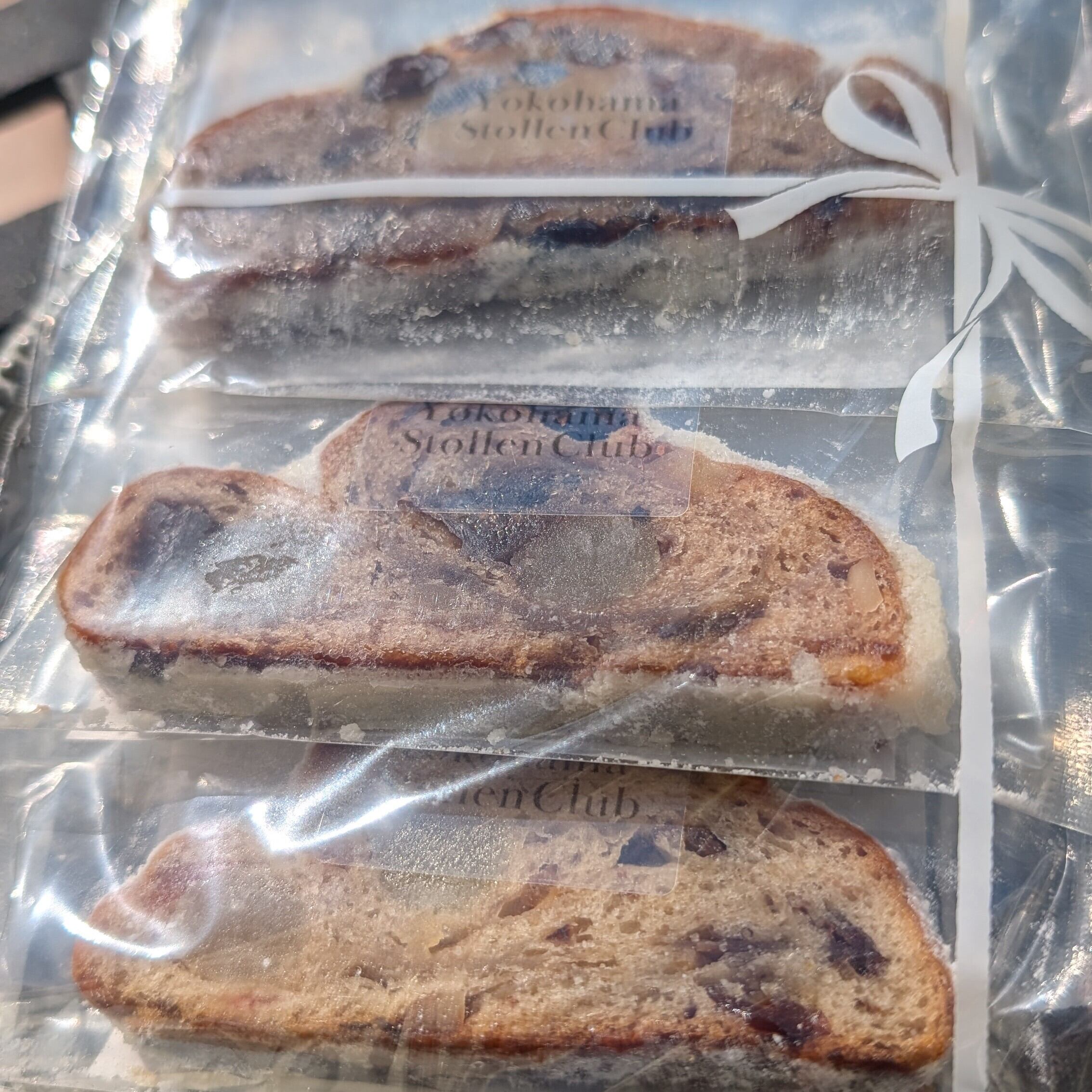 Yokohama Stollen Clubの定番プレーンシュトーレン・低糖質シュトーレン・そして該当月の月替りシュトーレン(今月は、ジュエルレモンシュトーレン)の1枚スライスを3枚詰め合わせでセットしました。